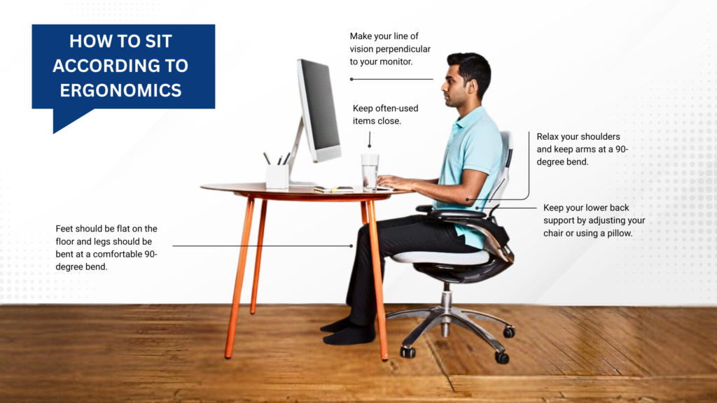 - The individual shouldn’t have to rotate the body to reach the computer or desk.